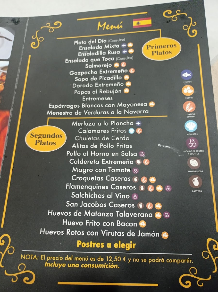 The menu also offers a range of desserts including Natillas, and café options such as Café con Leche. For lighter fare or snacks, selections like San Jacobos Caseros and Bocadillo Jamón Ibérico de Bellota are available.